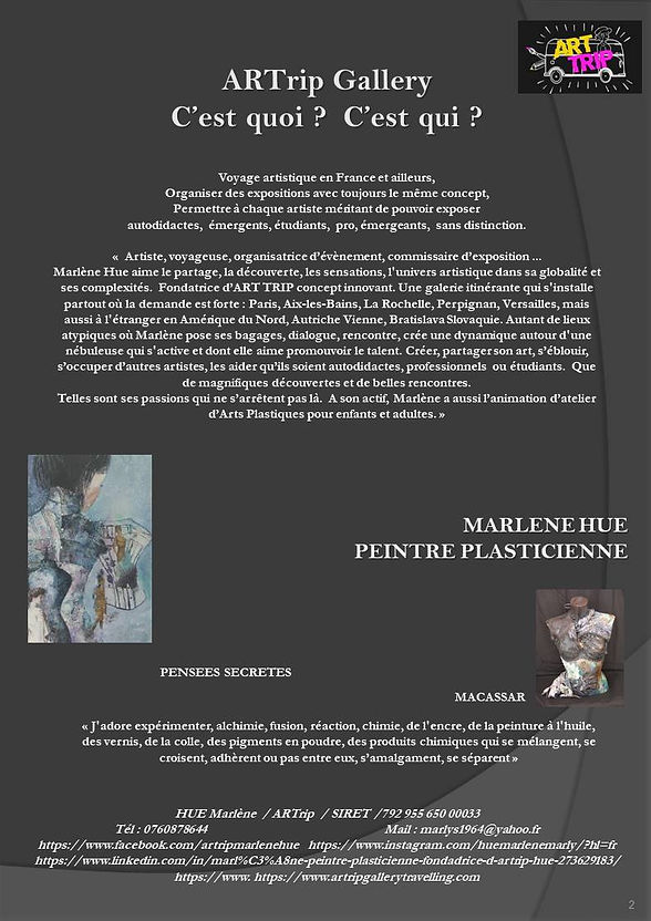 , Née à Paris en 1964, ma passion de l’art, je l’ai depuis toujours. Dans mes tableaux figurent à la fois sensualité et précision du trait, sous quelques influences venues des archives d’un autre siècle. Dès les prémices d’un tableau, je ne sais pas qu'elle sera la finalité exacte de ce que je commence. .J'adore expérimenter, alchimie, fusion, réaction, chimie, de l'encre, de la peinture à l'huile-des vernis, de la colle, des pigments en poudre, des produits chimiques qui se mélangent, se croisent, adhèrent ou pas entre eux, s’amalgament, se séparent. Je fais, construis, recommence, teste, obtiens des mélanges de couleurs atténués par l'effet de la ponceuse. Mon inspiration : corsets et femmes tout juste suggérés. A peine évoqués, qui n’en existent pas moins intensément. Les corsets me fascinent. Souvenir d’une vieille valise remplie de vieilles photos Mes grands-mères, arrières arrières grand-mères et tantes comme elles étaient belles Regardées admirées décrites racontées par deux grandes tantes dans un appartement de Paris maintes et maintes fois. Les photos, je les ai toujours, elles me les ont léguées. Je les garde comme un trésor avec quelques vieilles revues du siècle dernier. Elles m’ont conté, raconté l’histoire de leurs parents, grands parents... avec passion, amour et reconnaissance. J’ai voulu en savoir plus. Je me suis donc mise à fouiner, lire, relire, assouvir ma soif de curiosité en me lançant également dans la généalogie.